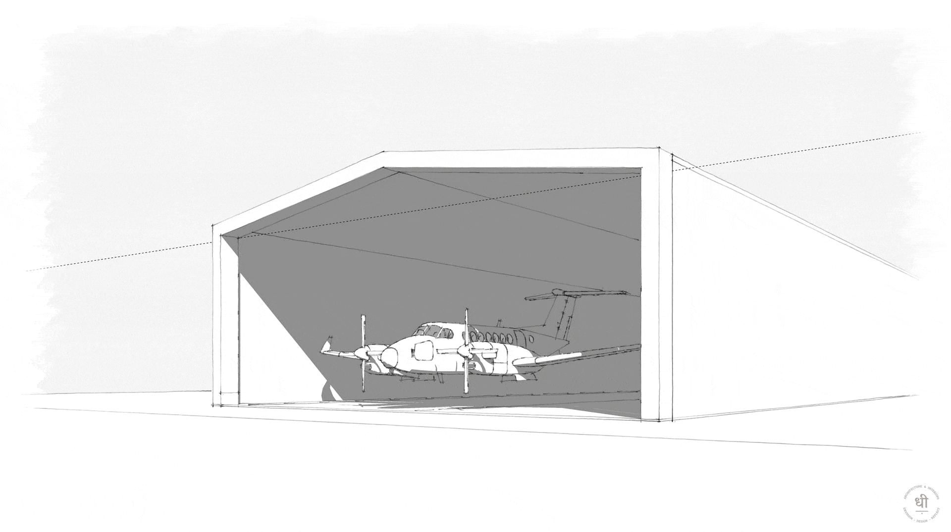 evoke an aircraft gracefully descending or parked within the hangar—a visual narrative capturing the